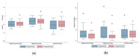 The distributions of the measured deviations for experienced and inexperienced operators are correspondingly presented in the box plots in Figure 7, Figure 8 and Figure 9. Generally speaking, no significant disparity was observed between experienced and inexperienced operators in terms of the positional deviations at the implant platform (Figure 7a and Figure 8a), and the depth deviations (Figure 9a) of each implant site. However, for the positional deviations at the implant apex (Figure 7b and Figure 8b) as well as the angular deviations (Figure 9b), implants placed by experienced operators tended to have larger deviations than inexperienced operators, especially at the right first molar and right second molar sites.