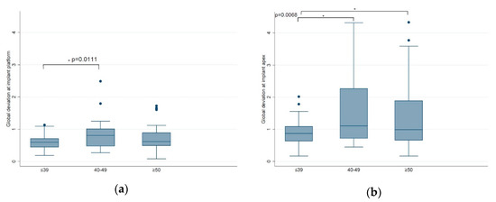 Box plots of the global deviation at implant: (a) platform and (b) apex of the three operator age groups.