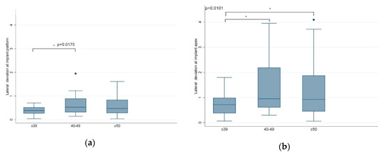 Box plots of the lateral deviation at the implant: (a) platform and (b) apex of the three operator age groups.