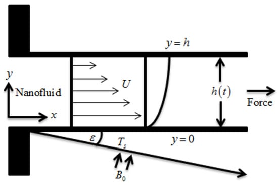 We have assumed the laminar and incompressible thin film flow of second grade fluid containing carbon nanotubes (CNTs) over a linearly extending sheet with Cattaneo–Christov model of heat flux. The stretching sheet is positioned at the starting point of a coordinate system as displayed in Figure 1. The stretching sheet moves along x-direction with a velocity where and are constants, and temperature is considered as . The width of the thin film flow is . Along the extending surface, a variable magnetic field of is applied with an allied angle . The stream function is taken such that and .