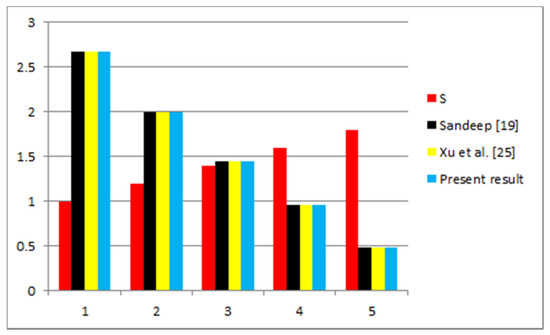 Figure 3 is designed to visualize the accuracy of the model provided by contrasting it with Sandeep [46] and Xu et al. [48], which addressed the nanofluids flow through a thin film under the magnetic impact. Thus, to compare our work, the special effects of all fixed factors are neglected. Great coordination is proven among the established comparison. It should be noted that the red colour represents the increasing values of unsteadiness parameter , black colour represents ref. [46], yellow colour represents ref. [48], and blue colour represents the present values.