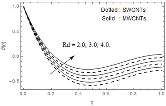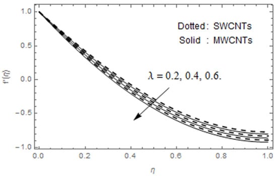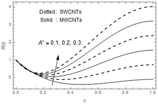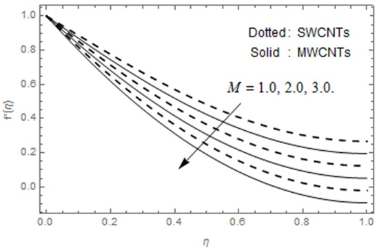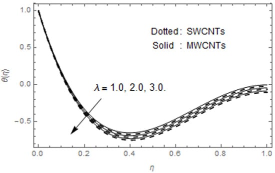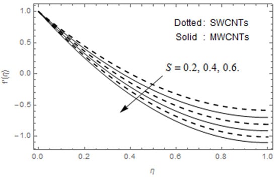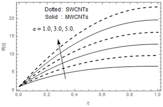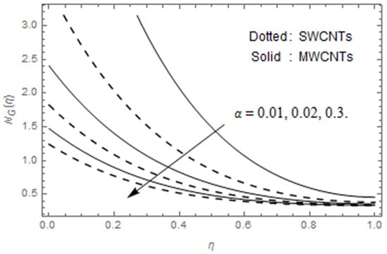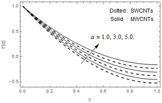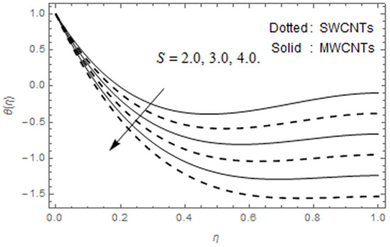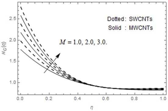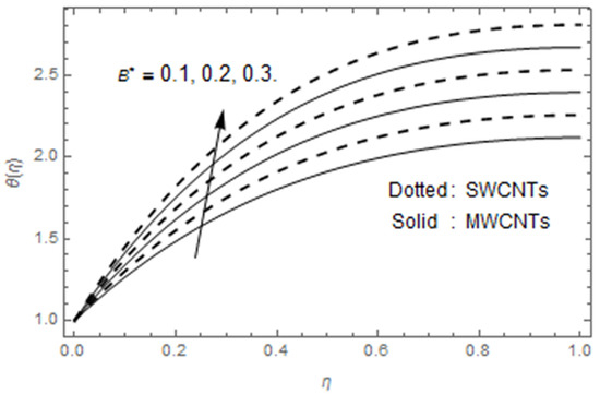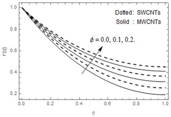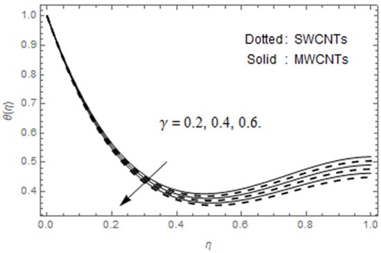 The consequences of nanoparticles volume fraction on velocity and temperature of the thin film second grade fluid flow containing SWNCTs and MWCNTs are shown in Figure 4 and Figure 5. Both velocity and temperature profiles heighten with greater values of volume fraction of nanoparticles. The relationship between nanoparticles volume fraction and convective flow is directly proportional. Therefore, the higher estimations of nanoparticles volume fraction increase fluid velocity and temperature for both cases of CNTs. The deviation in velocity function against magnetic parameter is displayed in Figure 6. Physically, the increasing magnetic field boosts up the Lorentz forces which increases the resistive force to fluid motion and consequently reduces. Figure 7 and Figure 8 exhibit the variations in and of the fluid flow via . The higher values of film thickness reduce both profiles of the flow. Increasing liquid film thickness parameter augmented the viscous forces, in due course reduces. This complies with the general physical nature of the film thickness parameter. Expanding the film thickness stops to permit the extra liquid. The impact of liquid film thickness parameter on is shown in Figure 8. A similar impact is observed for the temperature profile. The variations in velocity and temperature fields via dimensionless second grade fluid par are shown in Figure 9 and Figure 10. It is perceived that higher estimations of dimensionless second grade fluid par escalate and of the fluid flow. Infect there is inverse relation between the viscosity of fluid and . Therefore, the greater values of moderate the viscosity of the fluid, and accordingly the fluid velocity upsurges. Alike impact is also perceived in temperature profile. The variations in and via unsteadiness parameter are displayed in Figure 11 and Figure 12. Both and reduce with higher estimations of unsteadiness parameter . Physically, due to the greater unsteadiness parameter, the buoyancy effect actions on the flow and declines it. Thus, the momentum and thickness of the thermal boundary layer diminish. The deviation in temperature field via heat source/sink parameters and is displayed in Figure 13 and Figure 14. Actually, heat source/sink parameters and act like a heat creator. The greater heat source/sink, the greater heat will produce to the fluid flow. Therefore, temperature profile heightens via and . The variation in via thermal radiation parameter is displayed in Figure 15. increases with the heightens in thermal radiation parameter . This effect is because of the datum that the higher estimations of deescalates the mean absorption coefficient and escalates the divergence of radiative heat flux. Therefore, the thermal profile escalates with the rise in . The influence of thermal relaxation parameter on of the fluid flow is publicized in Figure 16. It is depicted that higher estimations of thermal relaxation parameter reduces . From here, it is concluded that the particles require much additional time for transferring of heat to its neighborhood particles and so the heat of the fluid reduces. Therefore, the higher estimations of reduce .