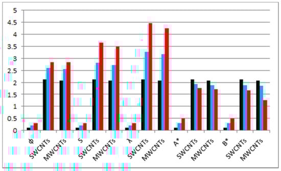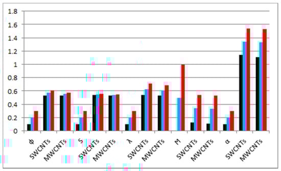 The engineers take interest to calculate some physical quantities in the flow/circulation of the fluid in some parts of the machinery, like the friction between the extending surface and the nanofluid and thermal transmission rate between the fluids and some solid parts of the mechanical system in the machinery. The friction between the nanofluid and extending sheet also affect the temperature of the nanofluid. This friction between the nanofluid and extending sheet is known as skin friction. Figure 17 is displayed to investigate the surface drag force in a thin film flow containing both SWCNTs and MWCNTs against the dimensionless parameters like nanoparticles volume fraction, unsteadiness, film thickness, magnetic, and second grade fluid. The surface drag force of the thin film flow containing both SWCNTs and MWCNTs heightens against nanoparticles volume fraction, unsteadiness parameter, film thickness, magnetic field parameter, and second grade fluid parameter. It is also depicted that the impact of dimensionless parameters on SWCNTs is dominant compared to MWCNTs. It should be noted that all the three colours (i.e., black, blue, and red) represent the variation in skin friction coefficient due to dimensionless parameters.