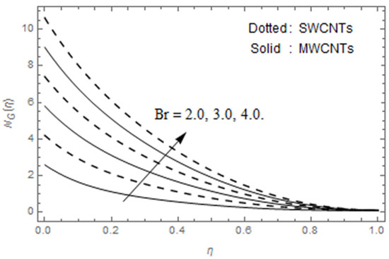 Figure 19 displays the impact of magnetic parameter on . The higher estimations of magnetic parameter escalate the entropy generation rate. The higher magnetic parameter effect, the greater the Lorentz force which increases the resistance of thin film fluid motion, and consequently the temperature increases. This heightens the thermal transfer rate at the wall as shown in Figure 19. Since entropy optimization is a function of temperature gradient, so the robust magnetic field escalates entropy optimization . Figure 20 depicts the impact of Brinkman number on entropy optimization . Here, entropy rate upsurges against higher estimations of Brinkman number. Actually is a heat created source within the fluid moving region. Heat generated together with the heat transmission from the wall increases the entropy optimization. The higher Brinkman number allows less thermal conductivity to the fluid flow and therefore boosted.