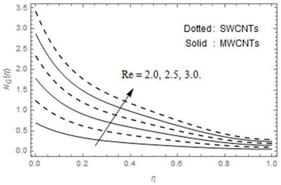 Figure 21 displays the variation in entropy profile via Reynolds number. The higher Reynolds number escalates . Physically, with a higher Reynolds number, the inertial force in the system increases the viscous force which enhances the disturbance in the fluid movement and promotes an increase in entropy generation. Therefore, entropy optimization increases due to the contribution of heat transfer. Figure 22 indicates the variation in entropy generation via temperature difference parameter . A decreasing impact is depicted here.