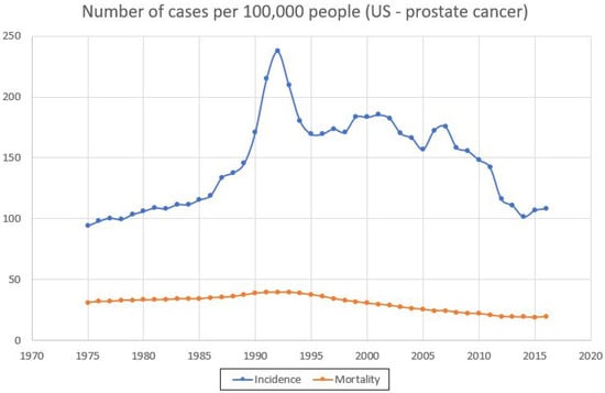 Prostate cancer (PCa) is the leading cause of cancer in US men (behind non-melanoma skin cancers), as well as the second leading cause of cancer-related mortality in men. The American Cancer Society estimates that in 2020, 191,930 Americans will be diagnosed with prostate cancer, with approximately 21.5% of all new cancer cases in men. The average five-year survival rate for all cases of prostate cancer is about 99%, which is a 31% point higher than in the 1970s []. However, once cancer metastasizes, the five-year survival rate drops to 30%, an increase of 10 percentage-point compared to the 1970s []. While the incidence of prostate cancer in the US is decreasing (see Figure 1), one possible cause is doctors’ discouragement of early PCa diagnosis due to the fear of overtreating cancer. Globally, the incidence of prostate cancer is increasing, especially among developing nations [].