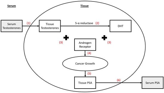 The prostate is a walnut-sized gland that is part of the endocrine system and the male reproductive system. Its main job is to secrete seminal fluids that are used to nourish and transport sperm. The function, proliferation, and atrophy of healthy and cancerous prostate cells depend highly on the circulating level of androgen, particularly testosterone []. Androgens are steroid hormones that regulate the development and maintenance of male characteristics by binding to androgen receptors (AR), which is a cytoplasmic receptor that is activated by binding to androgens, which induce the AR to migrate to the nucleus and bind to the Androgen Response Elements (ARE) within the DNA []. The testicular–hypothalamic–pituitary axis, also known as the hypothalamus–pituitary–gonadal axis—where gonads indicate the reproductive system—produces androgen in a negative feedback loop. This means that the higher the androgen level in the body, the lower its production rate becomes []. Approximately 90%–95% of the body’s androgen is produced by the testes and the remainder by the adrenal gland []. Once androgens, or testosterones, enter the prostate, about 90% is converted to the more potent form 5-Dihydrotestosterone (DHT) by the 5-reductase enzyme []. DHT has been observed to be a better agonist to the androgen receptors, with about 2–3 and 15–30 times higher affinity than testosterone and adrenal androgens, respectively [,]. Additionally, the unbinding rate of DHT and AR is roughly five times slower than that of testosterone and AR []. Once androgens bind to the AR, they are transported to the nucleus to bind to the ARE. This process results in the transcription of androgen-regulated genes, which signals the proliferation and inhibition of apoptosis in both healthy and cancerous prostate cells. The proliferation of prostate cells produces a prostate-specific antigen (PSA). Most of this byproduct of prostate cell growth is normally contained within the prostate wall; however, in the presence of prostate cancer cells, the cell wall is disrupted, which allows for an increased leakage of PSA into the bloodstream. For this reason, a simple blood test can be used to measure the level of PSA, which acts as a biomarker for prostate cancer and is often used as a proxy for tumor volume in mathematical models []. A simplified schematic of prostate cancer dynamics is described in Figure 2.