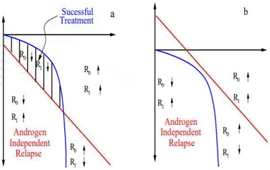 Treatment effectiveness in Jackson’s model—figure reproduced from Jackson [] with permission, which is distributed under a Creative Commons Attribution (CC BY) license. The vertical axis represents the proliferation rate of AD cells post treatment. The horizontal axis represents the steady state androgen concentration post treatment. The striped region indicates the tumor radius decreasing in the first and second order approximations. (a) The figure shows a small striped region in the parameter space where partial blockage of androgen leads to successful containment of the cancer. (b) Often times, successful treatment is not possible. Further analysis in the case of a complete blockage of androgen shows a small expansion of the successful region.