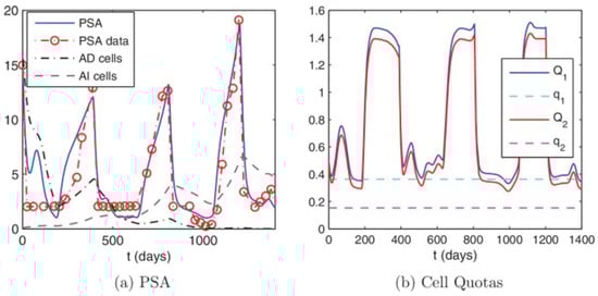 The fitting capability of Portz et al. model—figure reproduced from Portz et al. [] with permission, which is distributed under a Creative Commons Attribution (CC BY) license. (a) The red circles followed by doted dash lines are patient’s data. The blue curve represents the fitting of the model. The dashed black curve and dotted dashed curves represent the relative level of androgen independent (AI) and androgen dependent (AD) population as predicted by the model. (b) The plot shows the level of intracellular androgen for AD and AI cells ( and , respectively) relative to the minimum cell quotas for AD and AI cells ( and , respectively).