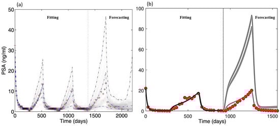 The fitting and forecasting capability of the Hirata, Bruchovsky, and Aihara (HBA) model—figures reproduced from [] with permission, which is distributed under a Creative Commons Attribution (CC BY) license. (a) An example of data fitting using the HBA model. The circles represent patient data. The black curve represents the model result after fitting to the patient’s data during IAS. The grey curve represents the simulated PSA level in the hypothetical situation when continuous androgen suppression therapy (CAS) is carried out. (b) An example of forecasting using the HBA model. The vertical dashed line represents the cut-off between fitting and forecasting.