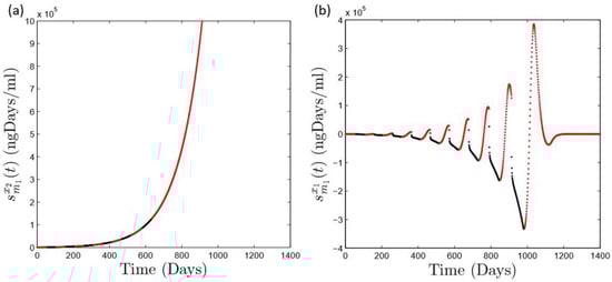 Example of varying sensitivity for parameter during IAS-figure reproduced from Voth et al. [] with permission, which is distributed under a Creative Commons Attribution (CC BY) license. (a) The sensitivity index of the mutation parameter with respect to androgen independent cancer cells for intermittent treatment. (b) The sensitivity index of the mutation parameter with respect to androgen dependent cancer cells for intermittent treatment. Note that while the dynamical behaviors of the sensitivity indexes can be non-trivial, they should be explainable using biological understanding of the system.