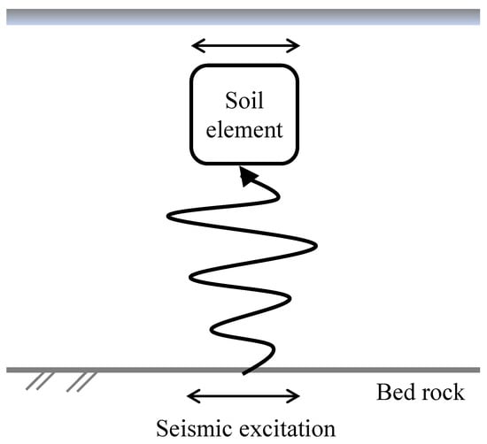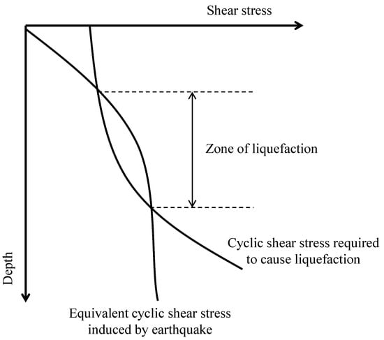 In the event of an earthquake, the seismic wave propagated from the bedrock reaches upper soil particles through the soil layer, as shown in Figure 1. In this case, liquefaction occurs when the underground cyclic shear stress caused by the earthquake exceeds the magnitude of the cyclic shear stress required to cause liquefaction. The zone of liquefaction is determined by comparing the magnitudes of the generated cyclic shear stress and shear strength according to the depth, as shown in Figure 2 (Seed & Idriss, 1971 []). Liquefaction is similar to the strain-softening behavior that occurs when sandy soil is subjected to shear stress under undrained conditions. This is the concept whereby the undrained strength gradually decreases to a certain state where the strain exceeds a maximum value; this strength value is referred to as the residual strength of the soil. Using this concept, it is possible to analyze the deformation of the soil-pile system caused by liquefaction through dynamic numerical analysis. This analysis is conducted by evaluating the zone of liquefaction caused by the seismic load, calculating the residual strength after liquefaction, and inputting the strength parameter corresponding to the residual strength into the zone of liquefaction. Liquefaction analysis by this process is referred to as total stress analysis.