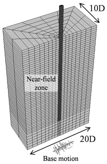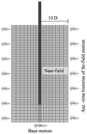 Three-dimensional numerical modeling is essential for appropriate and accurate simulation of soil-pile-structure dynamic interaction; however, 3D full-scale analysis is often time consuming, particularly when applied to dynamic problems. If an infinite number of soil elements are created to simulate the semi-infinite boundary of the actual site, the numerical analysis of various conditions becomes difficult. Further, the analysis efficiency decreases significantly because the analysis time increases sharply. However, if boundary conditions are not properly set in dynamic numerical modeling, the input wave propagating from the center of the model can generate a reflection wave at the boundary, complicating the simulation of the actual behavior. Therefore, in this study, the simplified continuum modeling method shown in Figure 4 was applied to reduce the analysis time and to properly the simulate dynamic behavior at the model boundary. Figure 4 shows the schematic of the simplified continuum modeling method adopted in the present study. The entire region is divided into two parts: near-field and far-field zones. The soil motion in the near-field zone is influenced by the soil–pile interaction and modeled in finite zones. The soil motion in the far-field zone not influenced by the soil–pile interaction is replaced as the boundary motion of the near-field zone. This modeling method can reduce analysis time compared to full modeling approach of two zones. Nogami et al. (1992) [], Wang et al. (1998) [], Boulanger et al. (1999) [], Bouzid et al. (2013) [], Kim et al. (2014) [], and Kim et al. (2015) [] applied similar approaches. However, their approaches replaced the far-field zone with nonlinear spring elements that simulate the interaction stress between the pile and nearby soil. In addition, these approaches were limited to 1D or 2D modeling. Kim (2011) [], Kim et al. (2012) [], and Kwon et al. (2013) [] applied the simplified method for 3D modeling to model a boundary condition of the soil-pile system in dry sand and validate applicability of the boundary model which input proper level of acceleration-time histories at the horizontal boundary of the model. In the present study, the method has been extended to simulate the dynamic behavior of a pile in liquefiable sand. The soil motion in the far-field zone is obtained from the independent site response analysis, which can simulate the liquefaction behavior of sandy soil. The horizontal soil acceleration-time histories along the depth in the far-field zone are applied at the boundary nodes of the near-field zone.