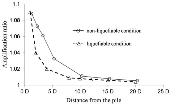 In the simplified continuum modeling method, it is necessary to determine the boundary extent of the near-field zone where the soil motion becomes identical to the far-field movement. In order to determine the optimal boundary extent of the near-field, the acceleration amplification ratio, which is the ratio of the amplitude of the maximum acceleration at the surface to the base input, was analyzed. The outline procedure of simplified continuum modeling is as follows. (1) Target system is modeled and analyzed by exerting earthquake load. (2) Obtain extent of near-field elements by plotting amplification ratio according to the distance from the pile center. (3) Only near-field is modeled and acceleration-time histories in far-field for each depth are input as boundary condition. Figure 5 shows the amplification ratio according to the distance from the center of the pile. The dynamic excitation of the pile increases the surface acceleration. Therefore, as the distance from the pile increases, the ratio decreases. The optimal distance with a constant ratio was determined to be 8 D (where D is the pile diameter). Finally, the boundary extent of the near-field was applied as 10 D from the center of the pile for the conservative modeling.