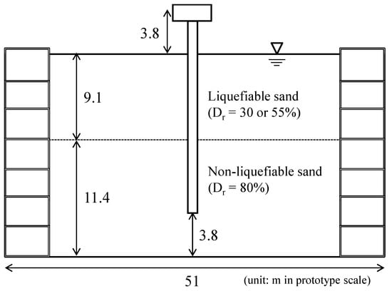 Verification of the proposed numerical model was carried out using the results from the centrifuge test conducted by Wilson (1998) []. The centrifuge test was conducted under centrifugal acceleration of 30 g, which corresponds to the length scaling factor of 30 using the National Geotechnical Centrifuge tester from UC DAVIS, and the model soil was constructed with two layers using uniform Nevada sand. The dense bottom layer (Dr = 80%) was 11.4 m thick and the loose top layer (Dr = 35% or 55%) was 9.1 m thick. All the soil layers were completely saturated (Figure 7).