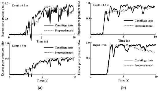 Comparison of excess pore pressure ratio in the free-field zone: (a) Case 1 (Dr = 55%) and (b) Case 2 (Dr = 35%).
