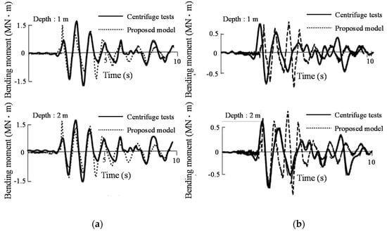 Comparison of the bending moment in a pile: (a) Case 1 (Dr = 55%) and (b) Case 2 (Dr = 35%).