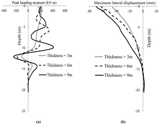 Dynamic pile response envelopes according to the thickness of liquefiable layer: (a) Peak bending moment along the depth, (b) Maximum lateral displacement along the depth.