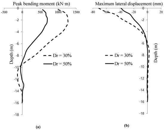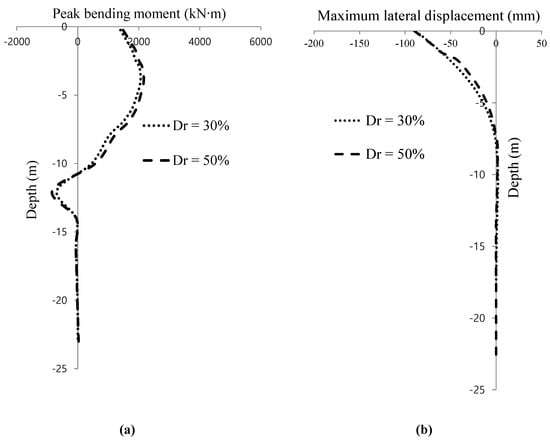 Dynamic pile response envelopes according to the relative density in liquefiable condition: (a) Peak bending moment along the depth, (b) Maximum lateral displacement along the depth.
