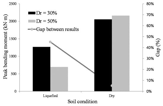 Figure 13 shows the peak envelopes of the bending moment and the pile lateral displacement along the depth both for Dr = 30% and Dr = 50% when input acceleration of 0.13 g is applied. As the relative density was increased from 30% to 50%, the peak value of the bending moment and the pile lateral displacement was decreased by approximately 45% and 40%, respectively. It would be due to the increases of liquefiable soil stiffness and relatively smaller values of kinematic force induced by soil movement. Usually, liquefaction hardly occurs in deeper depth because of the high confining pressure. The fully liquefied depth was approximately 3 m at Dr = 50% and approximately 5 m at Dr = 30%. Therefore, as the liquefiable layer became denser, the liquefied depth became shallower and the bending moment and the pile lateral displacement significantly decreased. These results show that soil compaction would be very effective for stabilization of a pile in liquefiable soil. On the other hand, this kind of behavior is wholly different from the dry sand case. Figure 14 shows peak envelopes of the bending moment and pile lateral displacement for different relative densities in dry sand (Kwon & Yoo, 2019 []). Strict quantitative comparison between two analysis cases would be improper because analysis condition of dry sand case was slightly different from liquefiable case, but qualitative comparison would be worthwhile to investigate critical distinction in trend of dynamic pile behavior according to the soil condition. It can be seen that dynamic pile responses show almost identical values for different relative densities in dry sand. It is significantly different pattern with liquefiable condition. In Figure 15, this phenomenon can be clearly identified by comparing peak values of dynamic bending moment obtained in different soil conditions. In the figure, black line graph with grey dots shows percentage of gap between peak value of dynamic bending moment for Dr = 30% case and Dr = 50% case for different soil conditions. The gap in liquefied soil condition shows much larger value than the gap in dry soil condition. It can be demonstrated that kinematic force is much more dominant in liquefiable sand than in dry sand from the results. Moreover, peak value of dynamic bending moment in dry soil condition for Dr = 50% was larger than that for Dr = 30%, which is different pattern with liquefied soil condition. Ground displacement tends to be out of phase with the inertial force, restraining the pile stress from increasing in dry soil condition, so it can be identified that Dr = 50% case exerted larger reaction forces on the pile foundation than Dr = 30% case in the figure. Based on a series of analyses, important dynamic characteristics as kinematic and inertial interaction for different soil condition were clarified by full-scale numerical simulation.