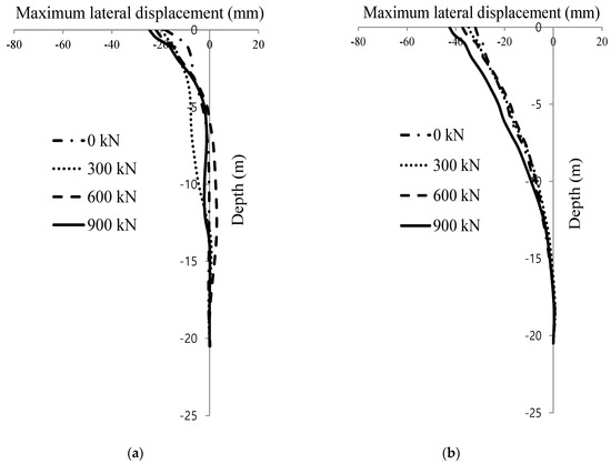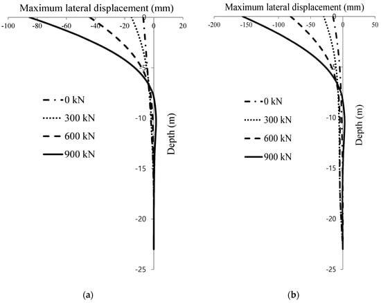 Effect of superstructure weight on lateral displacement of a pile in dry soil: (a) Input acceleration: 0.25 g; (b) Input acceleration: 0.25 g.