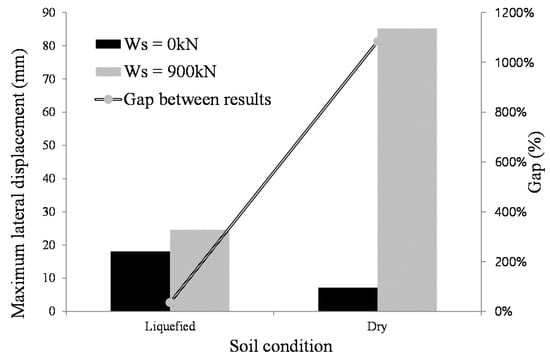 The effect of the weight of superstructure on dynamic pile response was analyzed by varying the weight of the superstructure at 0, 300, 600, and 900 kN. Figure 16 shows peak envelopes of the pile lateral displacement according to the weight of a superstructure when input frequency of 0.5 Hz was applied. Although the superstructure weight increased from 0 to 900 kN, the lateral pile displacements were very similar regardless of the magnitude of input acceleration. The maximum value of the pile displacement decreased only by 26% when the superstructure weight decreased from 900 kN to 0 kN under liquefiable conditions. Similar results were reported by Han (2006) []. Han (2006) [] analyzed the dynamic earth pressure on piles in liquefiable soil by 1 g shaking table tests and found that the amplitude of the dynamic earth pressure acting on the pile and the pile responses are similar irrespective of the superstructure weight. Figure 17 shows maximum pile lateral displacement envelopes for four different weight of the superstructure embedded in dry sand (Kwon & Yoo, 2019 []). It was noted that lateral pile displacements were remarkably varied for different weights of the superstructure in dry condition, in contrast to liquefiable condition. It was identified that the maximum pile displacement in dry condition decreased to 92% when the superstructure weight decreased form 900 kN to 0 kN, whereas those in liquefiable condition decreased only 26%. Figure 18 shows the effect of inertial force in different soil condition under earthquake by comparing peak values of lateral pile displacement. The gap in liquefied soil condition shows much smaller value than the gap in dry soil condition. The difference between results from different types of soil condition was strikingly distinctive. It can be demonstrated that inertial force is much more dominant in dry soil conditions than in liquefiable soil conditions. The similar observation was reported through field investigations by Ishihara (1997) []. He concluded that the inertial force is the predominant force in dry condition and responsible for the maximum bending moment near the pile head. These results showed that the effect of inertia induced by the superstructure was not remarkable under liquefiable condition compared with that under dry conditions.