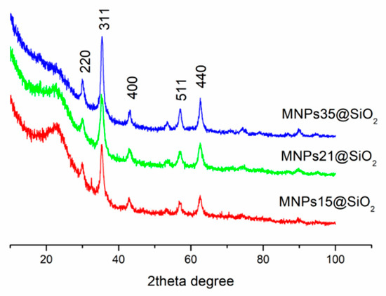 The XRD diffraction patterns of the nanocomposites showed the characteristic peaks of cubic spinel structure (9009768 –COD Database). A visible wide diffraction peak at 2θ ~22–25° indicate the presence of amorphous silica. Taking into account that separate batches of magnetic iron oxide nanoparticles were freshly obtained prior to each coating operation with various amounts of silica, minor variations of the average crystallite size may be observed. However, these variations are in the range of 3 nm, which shows very good reproducibility and precise control of the co-precipitation process.