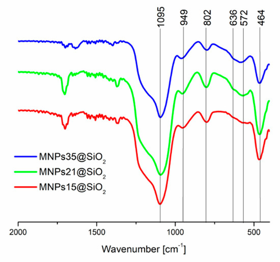 The spectra indicate the presence of both iron oxide and silica in the composite materials, due to the identification of characteristic bands of both components: the typical stretching vibration of Fe–O [14] shifted to 570 cm−1 due to the Fe–O–Si bond formed, antisymmetric (1090 cm−1) and symmetric (800 cm−1) Si–O–Si stretching bands, Si–O–Si or O–Si–O bending (460 cm−1) and Si–O stretching (950 cm−1) [26].