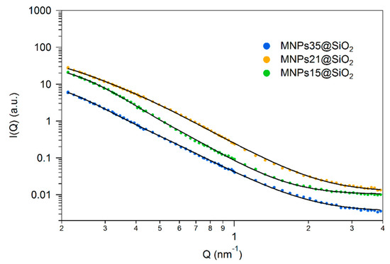 Scattering at low angles allows one to obtain information on the structure of the materials on length scales 1–100 nm. The scattering curves of the investigated samples are presented in Figure 4 in logarithmic coordinates.
