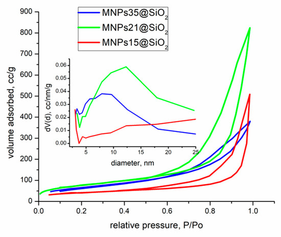 The specific surface area and total pore volume of nanocomposites increase with the increase of the targeted iron oxide concentration (Table 5) until a maximum of 270–275 m2/g, reached for samples MNPs35@SiO2 and MNPs21@SiO2. All the synthesized nanocomposites presented large and disordered pore size distributions.