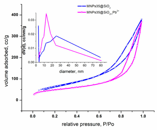 To investigate the stability of MNPs35@SiO2 nanocomposite in aqueous media N2 adsorption-desorption isotherms before and after adsorption process of Pb2+ ions were carried out and the results are presented in Figure 6.