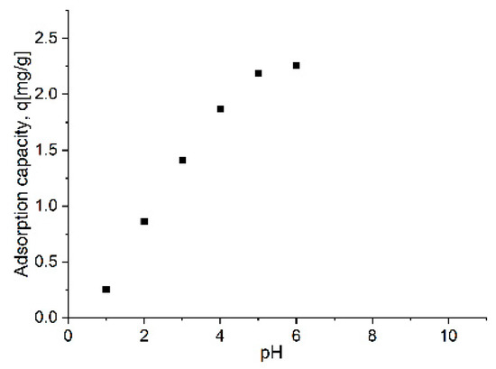 We suspended 0.1 g of the adsorbent in 25 mL solution of 10 mg·L−1 Pb2+ solution, for 1 h at 298 K. To adjust the pH of Pb2+ solutions in the 1–6 range, NaOH aqueous solution was used. Studies have not been conducted at pH > 6 because there is a risk of lead precipitation. The residual concentration was determined.
