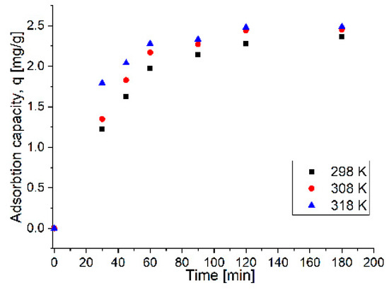 The experimental data shows that the adsorption capacity of the adsorbent material increases with contact time, reaching a maximum after 90 min. This high initial adsorption rate is due to the availability of a large number of adsorption sites present at the surface of the adsorbent at the beginning of the process. The selected contact time for further studies is set to 90 min. Increasing the temperature from 298 K to 318 K a small increase in the adsorption capacity, namely from 2.14 mg g−1 to 2.33 mg g−1 is obtained. This increase in adsorption capacity is economically insignificant, consequently the studies were continued at 298 K.