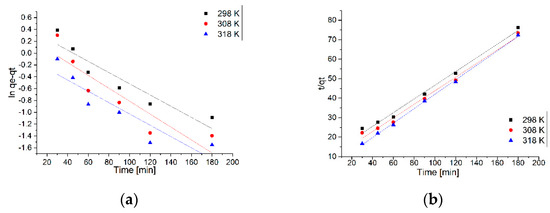 Kinetic models can identify the type of adsorption mechanism of the system and the potential stages to control the rate, including mass transport processes and chemical reactions [38]. The pseudo-first-order kinetic models, or the Lagergren model and pseudo-second-order, or the Ho and McKay model [39], were applied to describe the kinetics of the adsorption of Pb2+. The kinetic model that describes best the adsorption process can be established based on the values of the resulting constants and the obtained regression coefficient (R2). Thus, from the data presented in Table 7, it can be observed that the kinetic model of pseudo-second-order is the model that describe the adsorption process of Pb2+ ions on MNPs35@SiO2 nanocomposite, since R2 is in the range ~0.9919–0.9986, depending on temperature. This correlation is in line with the literature data showing that the adsorption process of Pb2+ ions is influenced by pH and temperature and that the chemical reactions between the functional groups present on the sorbent and the metal ions are the rate-controlling step throughout the sorption process [40,41,42].