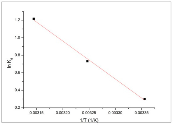 The standard variation of entropy ΔS° and, respectively, enthalpy ΔH° were calculated from the slope and the intercept of the linear plot of lnKd as a function of the 1/T (Equation (8)).