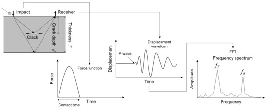 As shown in Figure 1, in the impact-echo system, an induced elastic wave at a surface of concrete propagates and reflected by defects or the surfaces in concrete. The received signal is monitored by a transducer coupled to the surface near the elastic wave source. The time-domain waveform is transformed into the frequency-domain one using the fast Fourier transform (FFT). The frequency spectrum contains those resonance frequencies due to reflections at such interfaces as the internal defects and the surfaces of the material of interest. When the P-wave velocity in the concrete is known, the detected peak frequency can be expressed as in Equations (1) and (2), respectively.