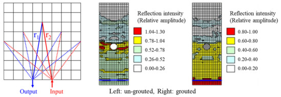 The SIBIE procedure has been applied for the case studies in the author’s previous research. The results for detecting grouted and un-grouted PC (pre-stressed concrete) sheaths is illustrated as in Figure 2 [11]. The size of each mesh is of dimensions 10 × 10 mm. In the figures, it can be observed that both grouted and un-grouted sheaths were clearly identified with the values of reflection intensities. The contour values are given as the relative amplitude, which is obtained by normalizing data with a maximum amplitude provided from the FFT result, of the P-wave intensity computed from frequency spectrum of received signal.