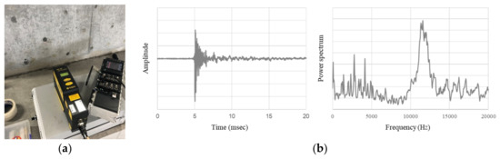 - Akamatsu, R.; Sugimoto, T.; Utagawa, N.; Katakura, K. Proposal of non-contact inspection method for concrete structures using high-power directional sound source and scanning laser doppler vibrometer. Jpn. J. Appl. Phys. 2013, 52, 07HC12. [Google Scholar] [CrossRef]