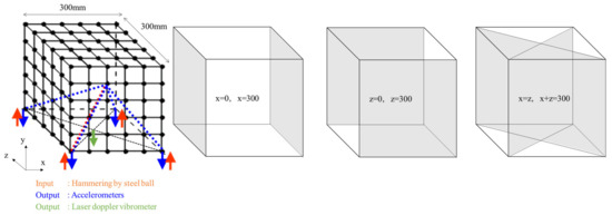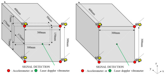 Concrete specimen using high-early strength cement was prepared for 30 MPa design strength. The size is 300 (x-direction) × 400 (y-direction) × 300 mm (z-direction). The thickness is defined as y-direction in this study. Figure 13 shows the geometrical information of concrete specimens and sensing (accelerometers and LDV) locations. As for experimentally simulating damage in concrete, a cubic styrofoam of 300 (x-direction) × 50 (y-direction for thickness) × 150 mm (z-direction) was embedded at 175 mm depth in the y-direction in the center of specimen.