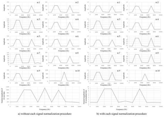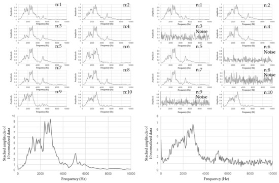 Meanwhile, some recorded waveform due to an impact of low energy may cause the low S/N (signal-to-noise ratio) signal and FFT indeterminate peaks. The procedure of FFT signal data stacking with/without including low S/N waveforms are shown in Figure 7. Tapping 10 times according to the above-mentioned steps for 3D SIBIE method, FFT peak stacking results in giving an incorrect data with unclear frequency spectrum when some signals into a sensor are not entirely high S/N, wherein n = 3, 6, 8, 9 for the example. As a consequence, between the process of 5 and 6 for the development of the 3D SIBIE procedure, low S/N signals are removed from the computation to guarantee data quality. The FFT signal data stacking result without signal normalization procedure is indicated numerically as in Figure 8, where the process of 6 is excluded. It is obvious that the spectrum of n:3 is different from others in 5 kHz implying that this is attributed to some noises. As shown in Figure 8a, the stacked amplitude of 10 raw data without the signal normalization is influenced by the noise signal of n:10 but now found in Figure 8b. The normalization for each frequency spectrum before stacking is thus very effective on the data acquisition process of the 3D SIBIE procedure.