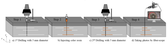 The 3D SIBIE procedure has been applied for existing structures. A RC bridge deck in service was targeted. Two different areas were selected for the case study after the crack inspection work. The crack inspection procedure is schematically described in Figure 9 with 4 steps as follows.