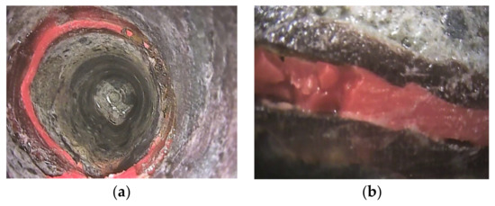 Figure 10 shows an example of the view from the fiberscope when it caught the crack filled with resin. In this way, damaged and non-damaged namely intact parts are chosen for the 3D SIBIE procedure. Figure 11 shows the 3D SIBIE result for the RC deck in the intact part and Figure 12 shows that for RC deck in the damaged part where a lateral crack in concrete and also delamination between an asphalt pavement layer and a concrete layer was found. The sensor array was placed on the bottom surface of the deck and measurement was carried out for the 3D SIBIE procedure. The top surface denotes that of asphalt pavement and the bottom shows the bottom of the concrete layer both in Figure 11 and Figure 12. In these figures, the thickness of the concrete layer is 0–180 mm, 180–250 mm in the fiber reinforced concrete (FRC) overlay, and the asphalt pavement is 250–300 mm from the bottom. In the intact part as shown in Figure 11, no sharply defined reflection intensity is found in the volume of interest while, for the damaged part as shown in Figure 12, the color gradations show strong reflections of elastic waves due to anomaly such as cracks or voids around the bottom of the RC deck (see the bottom area in the right side sectional view). Also, three layers consisting of concrete, FRC and asphalt can be classified by the 3D visualized image. As the strong reflections are obtained from the large difference of acoustic impedance of which the individual materials have, the delamination between the asphalt and the concrete layers, which can be visually confirmed, and sub-critical cracks, which cannot be visually confirmed, are possibly attributed to this fact.