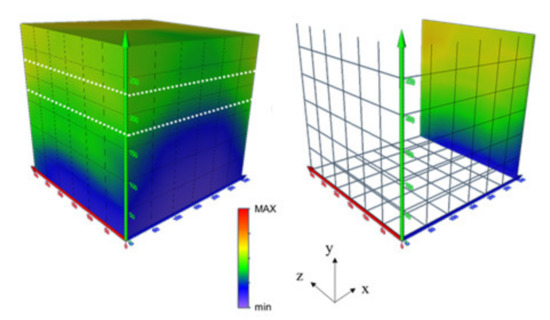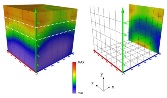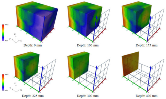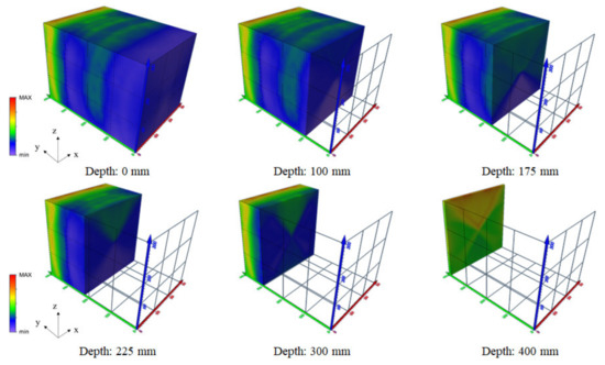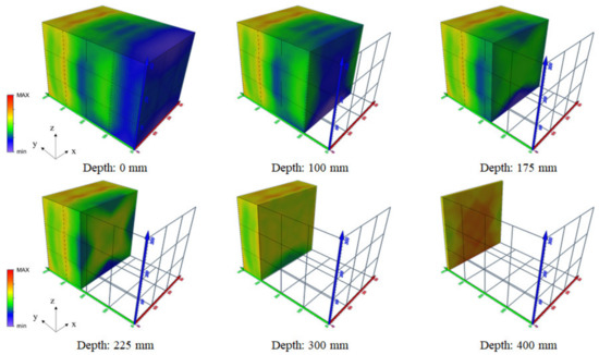A laser doppler vibrometer for detecting signals has been introduced for the 3D SIBIE procedure to visualize the simulated damage in the concrete specimen. When LDV signal detection is applied and the data are introduced to the 3D SIBIE procedure, the visualized images in Figure 16 successfully indicate the defect position with higher reflection intensity at the middle depth of the specimen than that at the other area in the targeted volume of interest. On the other hand, when it is applied to the intact specimen as shown in Figure 17, an intensive reflection is only obtained from the thickness at 400 mm depth in the y-direction, as is the case of the accelerometers.