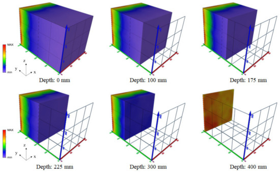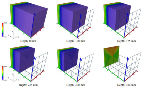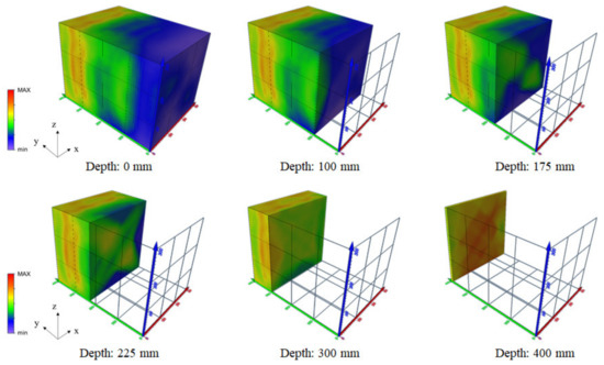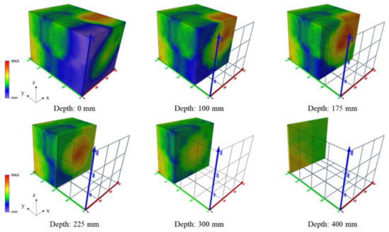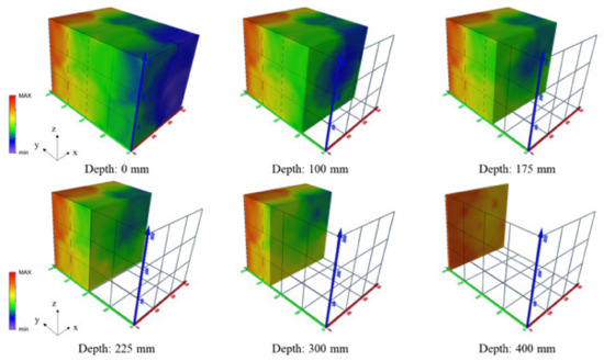 As shown in Figure 14 and Figure 15, when the accelerometer array unit is employed for detecting signals, in the visualization results with the 3D SIBIE procedure for interior concrete, the location of defect (simulated damage) is clearly identified from 175 to 225 mm in the depth (y) direction in Figure 14, where higher reflection intensity is given, while no remarkable changes is not found in other depths as well as in the intact specimen as shown in Figure 15. Note, the values of reflection intensities are provided as color gradations relatively from 0 to 1 as normalized data based on the maximum value of each contour displayed. The reflection intensity at the embedded styrofoam is even lower than that of the thickness reflection at 400 mm depth in the y-direction, since the acoustic impedance of air is obviously lower than that of the styrofoam. As for the result of intact concrete in Figure 15, only the thickness reflection is demonstrably observed at 400 mm depth in the y-direction.
