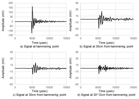 In the same manner as in the signal amplification method of PIT principle, the method is also introduced for the 3D SIBIE procedure to correct the reflection intensity in the visualization results. Figure 19 shows some examples of actually recorded signals with the accelerometer sensor array, explained in Figure 13, followed by hammering at concrete surface. In order to define an exponential function for signal amplification in consideration with the signal attenuation through the targeted concrete, an exponential function is derived for each data set from the obtained waveforms as in Figure 20.