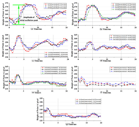 The height of the reference point A on the weld pools surface as a function of time. Full penetration: (a) V = 11 cm/min; (b) V = 13.75 cm/min; (c) V = 16.5 cm/min. Critical penetration: (d) V = 19.25 cm/min. Full penetration: (e) V = 24.75 cm/min; (f) V = 30.25 cm/min; (g) V = 35.75 cm/min.