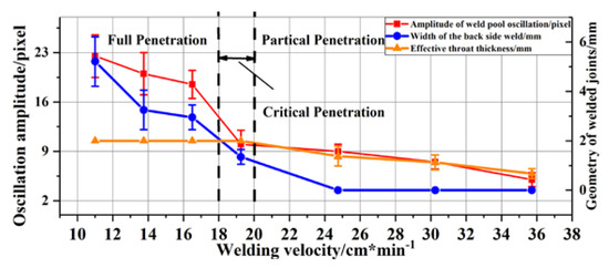 Figure 8 shows the curves of oscillation amplitude and the geometry of weld joints with different welding speeds. The oscillation amplitude decreased with increasing welding speed and an abrupt change occurred in the amplitude of weld pool oscillation with the transition from full to partial penetration status. Different boundary conditions between partly and fully penetrated weld pool led to different oscillation modes and amplitude. Figure 9 shows the oscillation mode with different penetration status. For partly penetrated weld pool, the bottom of the weld pool was supported by the solid material, which obstructed the downward movement of the molten metal. It led to a greater loss of energy in the process of oscillation, resulting in a lower amplitude. As for critical penetration status, the main part of the pool was supported by the solid metal with relatively small W, leading to the similar oscillation behavior as the partial penetration, as shown in Figure 6d,e. As for full penetration, W was relatively larger. The weld pool was only supported by the surface tension of the molten metal within the range of W. In this case, a new free surface and degree of freedom were generated in the weld pool, which led to a change in the oscillation mode of the weld pool. Zacksenhouse and Hardt established an analytical model based on the theory of stretch membrane and studied the oscillatory behavior of the fully penetrated pool [16]. It was found that the oscillation amplitude of the stationary full penetration pool was more intense than that of the partial and critical penetration due to the lack of solid boundary constraint at the weld pool bottom.