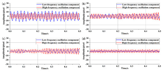 As shown in Figure 11a–c, there were two continuous wavelet ridges in the contour diagram of the transform coefficient of oscillation of the full penetration pool. The scale vectors were 200 and 100, respectively, and with the Equation (2), the corresponding oscillation frequencies of the weld pool were 40 Hz and 80 Hz, respectively. As indicated by paper [18]. The pool was a dynamic system excited by periodic signals under the impact of a fixed frequency, oscillating at the same or integer multiple of the pulse frequency (40 Hz). There were also two wavelet ridges with the same scale vector in the wavelets of the oscillating signals in the weld pool, but the wavelet ridge with the scale vector of 200 was inconsecutive as shown in Figure 11d. As for partial penetration, only one wavelet ridge curve with the scale vector of 100 occurred in the contour diagram of transform coefficient, as shown in Figure 11e–g, and the corresponding oscillation of the partly penetrated weld pool was 80 Hz. The corresponding wavelet skeleton at the wavelet ridge curves was the composition of the weld pool oscillation signal at this frequency [17]. Figure 12 shows the composition of the weld pool oscillation signal at 40 Hz and 80 Hz with different penetration status.