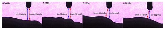 High-speed photographic images showed that the weld pool oscillation changed the relative position between the tip of the welding wire and the surface of the weld pool. It affected the arc length and caused the voltage signal fluctuation during the base time, as shown in Figure 13. The shortest distance (LV) and vertical distance (Lmin) between the droplet and the pool during the base time were measured by image processing algorithm (as shown in Section 2.1), and the relationship between the pool behavior and the voltage was analyzed.