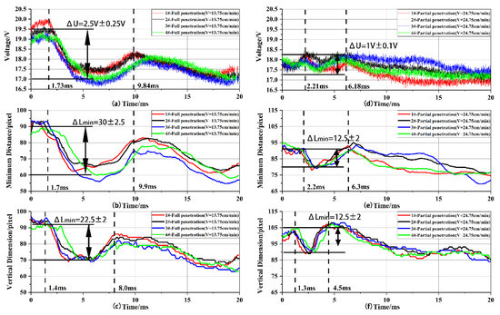 The synchronous curves of the voltage signal, the minimum distance (Lmin) and the vertical dimension (LV). Full penetration (V = 13.75 cm/min): (a–c). Partial penetration (V = 24.75 cm/min): (d–f).